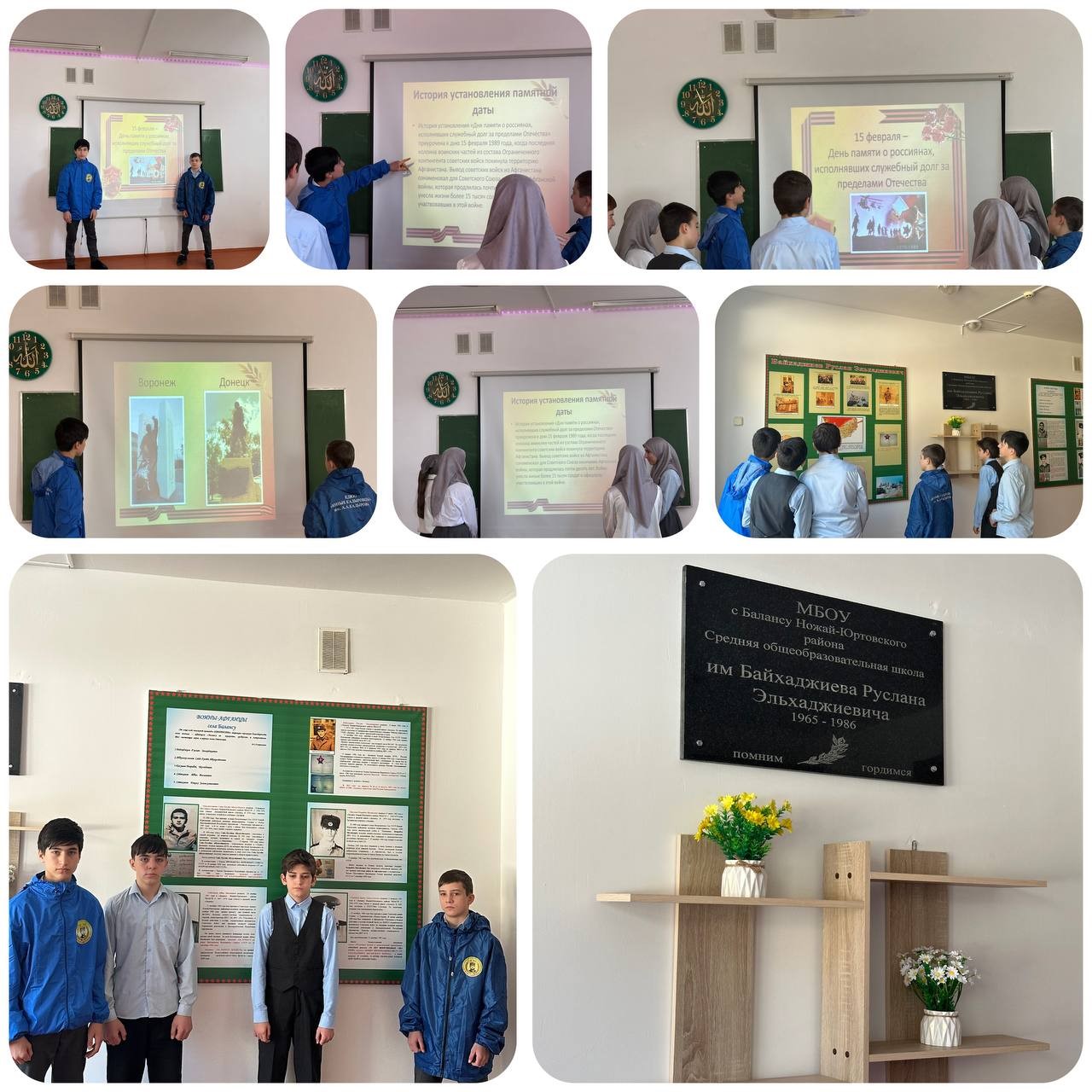 14.02.202514.02.2025г. в МБОУ "СОШ им.Р.Байхаджиева с.Балансу" во взаимодействии с Отделом Ножай-Юртовском районе УФСБ России по Чеченской Республике совместно с Юными Кадыровцами в 7-х классах проводился Классный час на тему: "День памяти о россиянах, исполнявших служебный долг за пределами Отечества"