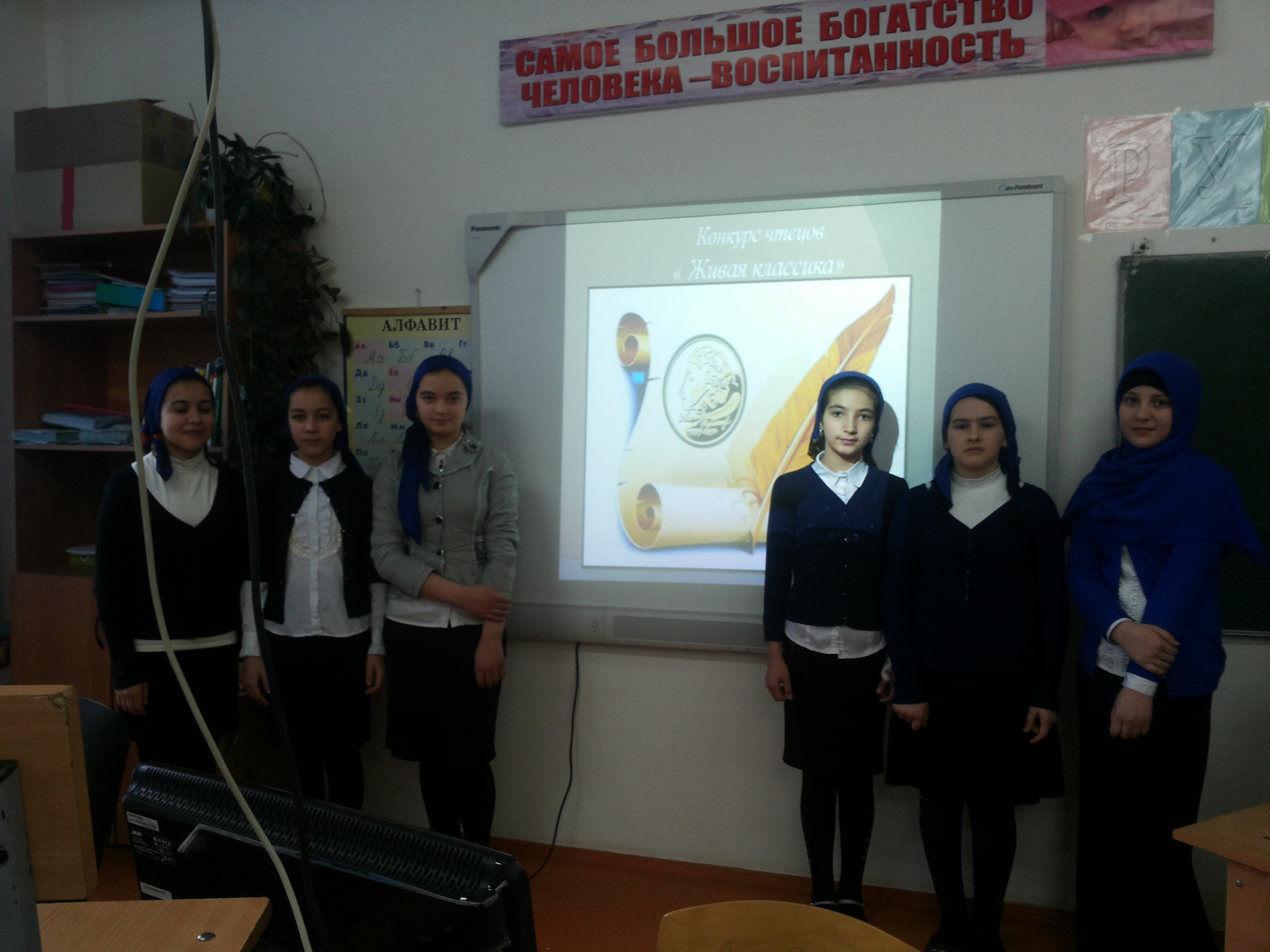 11.02.201511 февраля в МБОУ «СОШ им.Р.Байхаджиева с.Балансу Ножай-Юртовского муниципального района»прошел школьный этап Всероссийского конкурса «Живая классика» среди учащихся 6-7 классов. В конкурсе участвовали 6 человек: Мирзаева Сабина, Касумова Элиза, Байхаджиева Раяна, Мовсарова Зулихан, Тарамова Хеда, Чинаева Хеда. «Живая классика» - это Всероссийский проект, соревновательное мероприятие по чтению вслух отрывков из прозаических произведений российских и зарубежных писателей. Его цель – вернуть подрастающее поколение к книге. Ведь чтение книг – полезное дело. Оно даёт знания, расширяет кругозор, учит быть хорошими, талантливыми людьми, прививает такие нравственные качества как доброту, милосердия, отзывчивость. Основными критериями оценки юных чтецов были: выбор произведения, грамотная речь, артистизм исполнения произведения и глубина проникновения в образную систему и смысловую структуру текста. Конкурс шёл. Конкурсанты сменяли один другого. Но неизменным оставалось одно - это атмосфера живого слова русских писателей, создаваемое юными чтецами. И зрителям, и членам жюри приятно было осознавать, что юные конкурсанты понимали, о чём читают, ведь они вдумывались в текст и сопереживали любимым героям. Состав жюри школьного этапа Всероссийского конкурса юных чтецов «Живая классика» : Председатель жюри:Товсултанова К.К. – зам. директора по УВР. Члены жюри:1.Мирзаева А.А. – учитель русского языка и литературы.2.Кулаева З.А. – учитель начальных классов.3.Умархажиева З.З. – учитель истории и обществознания. Ответственный за проведение конкурса – Мирзаева Амина Абуселимовна, учитель русского языка и литературы. Участники конкурса «Живая классика» читали наизусть стихотворения в прозе И.С.Тургенева, отрывки из произведений Толстого, Гоголя, Гете, Р.Гамзатова. Зафиксированное время – 5 минут. По признанию жюри, лучших чтецов определить было трудно. Все участники конкурса выступили достойно. Но проникновенное прочтение ученицы 7 б класса Мирзаевой Сабины Арсеновны, не оставило никого равнодушным. Она прочитала наизусть стихотворение в прозе И.С.Тургенева «Милостыня». Таким образом, победителем школьного тура Всероссийского конкурса «Живая классика» стала Мирзаева Сабина Арсеновна, ученица 7 «Б» класса; 2 место получила Чинаева Хеда, ученица 7 «А» класса; 3 место завоевала Тарамова Хеди, ученица 7 «А» класса. Все участники получили памятные призы, а члены жюри отметили, что все 6 учащиеся продемонстрировали грамотное и эмоциональное чтение, просто кому-то больше повезло с текстами, а кому-то достались более сложные отрывки из знаменитых произведений литературы. Победителям конкурса хочется пожелать достойного участия в муниципальном этапе Всероссийского конкурса «Живая классика», который состоится 12 марта 2015 г.